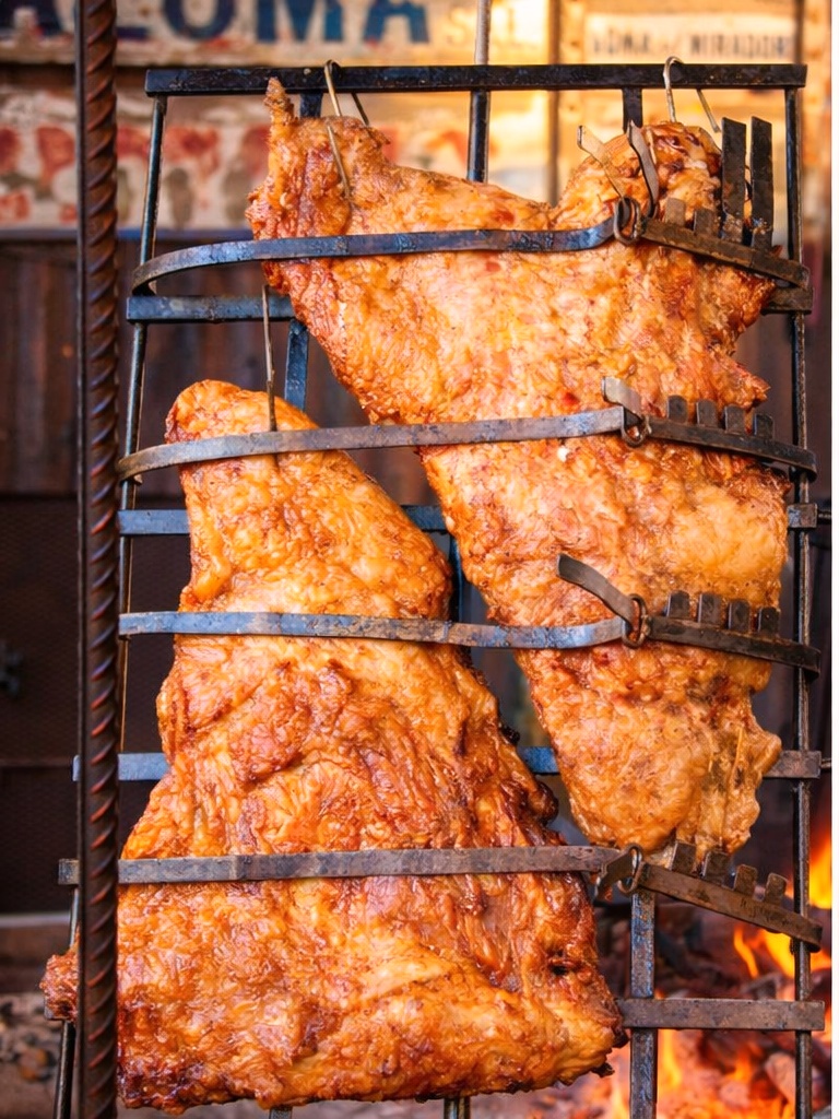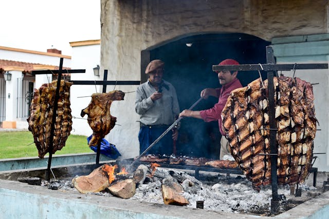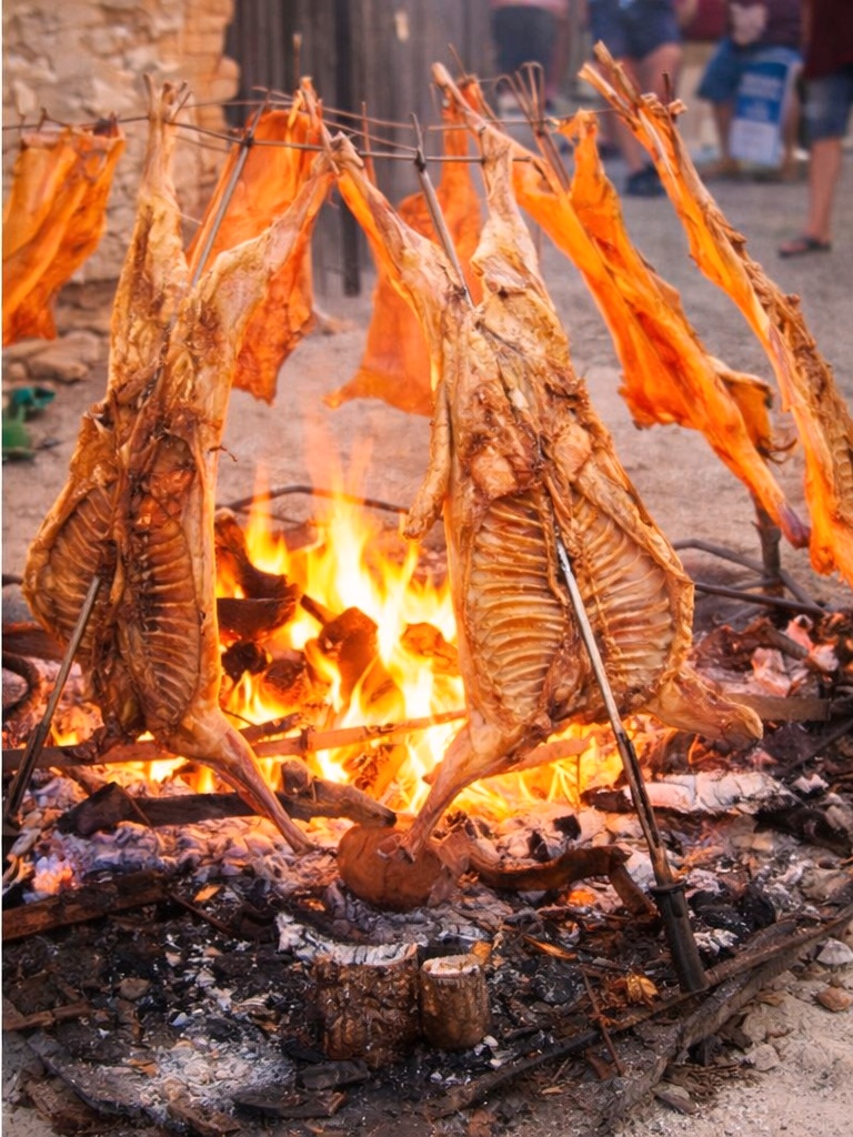 Los gauchos, durante largas jornadas de trabajo en la inmensidad de la pampa o la Patagonia, cocinaban animales enteros ensartados en una estructura metálica clavada en la tierra, inclinada hacia el fuego. El método permitía una cocción lenta y pareja, utilizando únicamente leña y paciencia.