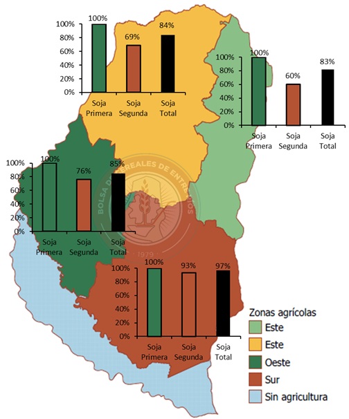 Según el último relevamiento del Sistema de Información de la Bolsa de Cereales de Entre Ríos (SIBER), la siembra de soja de primera ya se encuentra finalizada, con el 100 % del área implantada. En el caso de la soja de segunda, el avance promedio provincial alcanza el 80 %.
