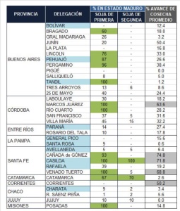 El cuadro muestra el porcentaje de área ya en estado maduro, tanto para soja de primera como de segunda, de cuerdo al informe citado. En verde se resalta las delegaciones que reportaron más del 50% del área alcanzando ya ese estado.